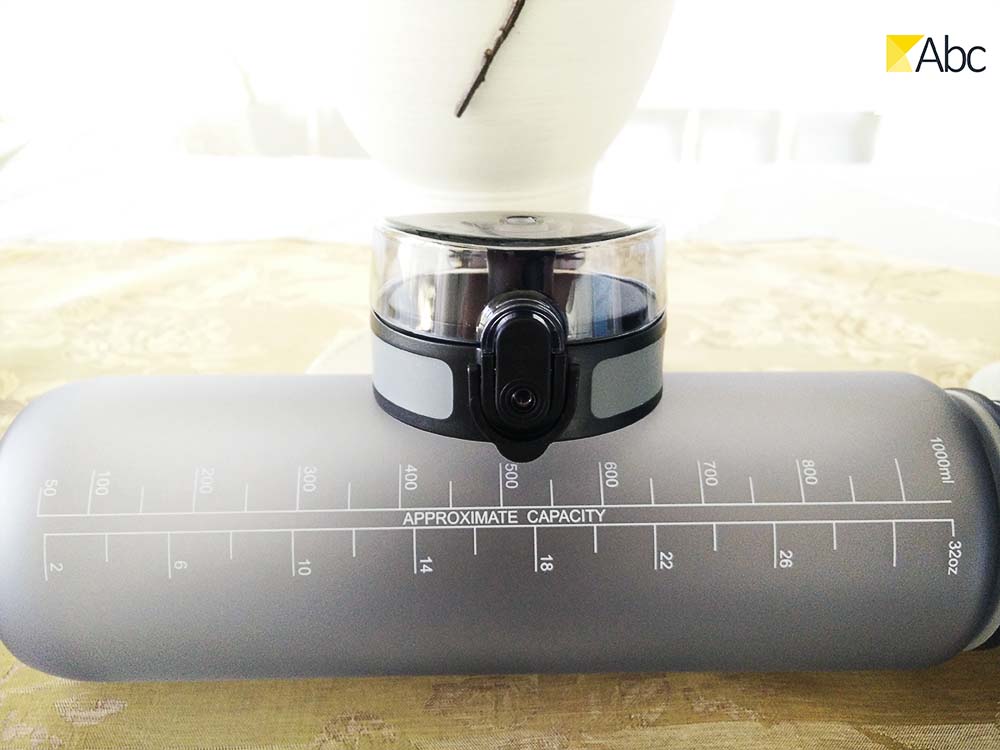 Auf der gegenüberliegenden Seite vom aufgedruckten Logo findet man die Skalierung. Diese ist Links in Milliliter (ml) und Rechts in Ounce (oz) beschriftet. Da ich die 1L Variante gekauft habe, reicht bei mir die Skalierung bis 1000 ml bzw 32 oz. Als Nächstes habe ich einmal den Deckel abgeschraubt. Auch hier merkt man alleine vom Schrauben, das die Flasche dicht hält. Die obere Öffnung (hier wird die Sportflasche befüllt) hat einen Durchmesser von ~5,5 cm. Insgesamt ist der Körper 18,1 cm hoch. Mit Deckel, welcher eine Höhe von 4,4 cm hat, kommt die Flasche auf eine Höhe von insgesamt 22,5 cm. Laut meiner Küchenwaage hat sie ein Gewicht von ~150 g. Das ist meiner Meinung nach weder zu schwer noch zu leicht. An der oberen Seite der Sport Trinkflasche befindet sich übrigens noch ein Tragband. Dieses kann für einige Menschen bestimmt von Nutzen sein. Ich persönlich habe es aber abgenommen.